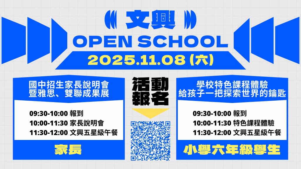 四、為使社區家長了解本校基督為本的核心教育理念,並讓社區學生認識天主教學校,特於114年11月8日(六)上午文興OPEN SCHOOL DAY辦理學生闖關遊戲及家長說明會,活動說明(如附件三)。