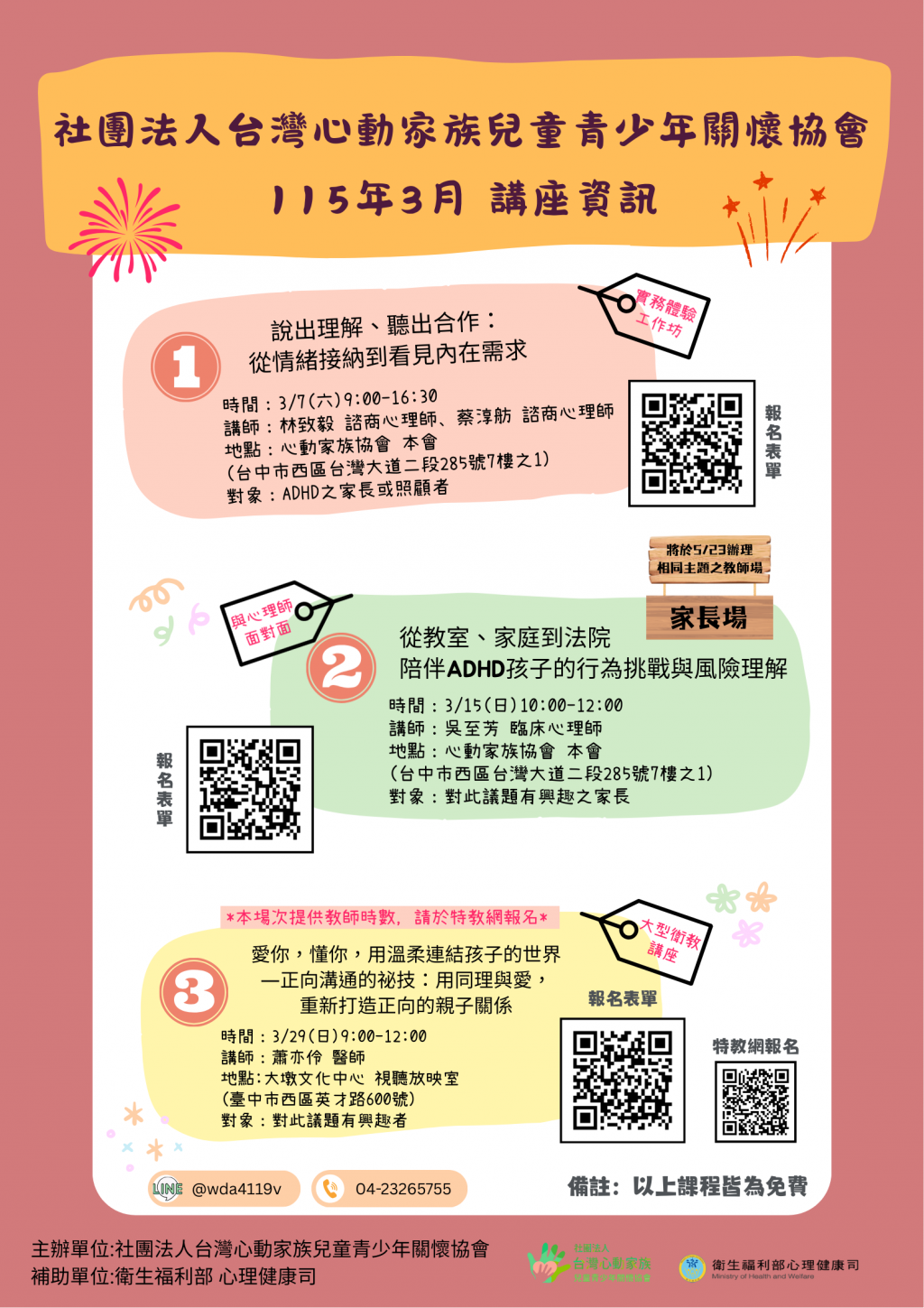 主旨:請貴單位協助轉知本會辦理「115年03月 ADHD 相關主題講座及工作坊」海報,敬請貴單位協助公告並轉介符合需求之家長、照顧者、及教師等專業人員參與,請查照。